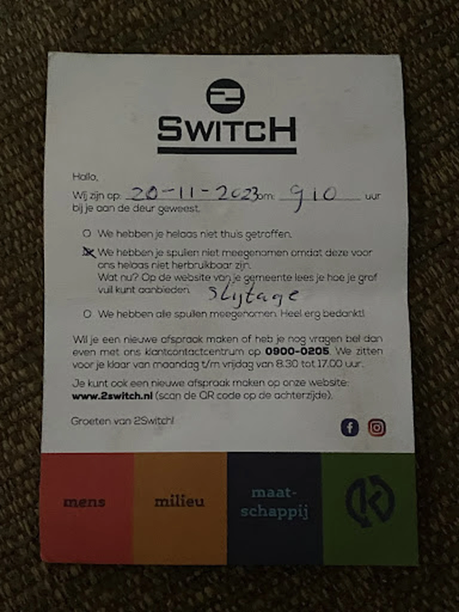 Toegevoegd op 24-10: Onze bank was in perfecte staat, we hebben er voor gezorgd dat we ons aan alle voorwaarden hebben gehouden. De chauffeurs hebben hun werk gewoon slecht verricht. Niet alleen hebben we de bank helemaal gereinigd voor jullie, de bank had geen enkele beschadiging, geen enkele vlek, werkte nog perfect, was helemaal compleet. Met andere woorden, zo goed als nieuw. Bespaar jezelf de moeite om deze nep kringloop winkel te voorzien van je spullen. Het zijn alleen maar ondankbare mensen die eigenlijk alleen nieuwe en ongebruikte spullen willen. Niks kringloop winkel. Van ons krijgen jullie tenminste niks meer dan een zeer slechte review. Want als ik - 5 sterren kon geven had ik dat gedaan. Jullie beweren een kringloop winkel te zijn maar volgens mij weten jullie niet wat dit betekend. We hebben nog geen jaar geleden een creme kleurige 2-zits bank gekocht bij de Ikea. Bijna anderhalf maand geleden hebben we besloten ons appartement te herinrichten en een nieuwe, grotere bank via marktplaats aangeschaft. We hebben onze oude bank helemaal gereinigd; gestoomd, de hoezen gewassen en vervolgens 2switch ingeschakeld om de bank een nieuw leven te geven. We hebben gewoon een dikke middelvinger gekregen. S ochtends om kwart voor 8 (op onze vrije dag!!) de bank in de kou en miezer regen naar beneden gesjouwd. Zorgvuldig ingepakt in een groot stuk plastic met een mooi kartonnen bordje onder het plastic voor de duidelijkheid. We hoorde niks verder en uiteindelijk gecheckt of de bank er nog stond, en ja hoor, een briefje gevonden. Wat staat erop? We hebben hem niet meegenomen vanwege Slijtage . Ik weet niet wat voor een slijtage een bank van nog geen jaar oud moet hebben maar de chauffeurs zijn dan behoorlijk blind. We zijn maar met ons 2e zonder kinderen en geen huisdieren dus de slijtage waar jullie van spreken is vrijwel onmogelijk! Ze hebben trouwens ook wel mooi dit briefje onder het plastic geyeet maar vervolgens niet omgekeken of het plastic wel weer goed zat want er is nu dus gewoon een stuk bank nat geworden. Jullie zijn een enorm ondankbaar bedrijf. Een prachtbank van nog geen jaar oud, helemaal gereinigd voor jullie met zogenaamde slijtage. Wat jullie echte reden was tot weigering zullen we wel nooit te weten komen maar slijtage was gewoon een slappe smoes. Als jullie de bank niet wilde omdat ie niet nieuw genoeg was had het dan gewoon eerlijk aangegeven. Bij deze erg bedankt want we kunnen de bank nergens anders kwijt dus het word grofvuil. Terwijl we iemand hartstikke blij hadden kunnen maken met deze prachtbank. Maar dit blijkt jullie prioriteit duidelijk niet. Ik hoop dat jullie de consequenties van dit rare gedrag snel zullen merken want dit is geen manier om met jullie klanten om te gaan. En helemaal niet om een kringloop winkel te runnen.