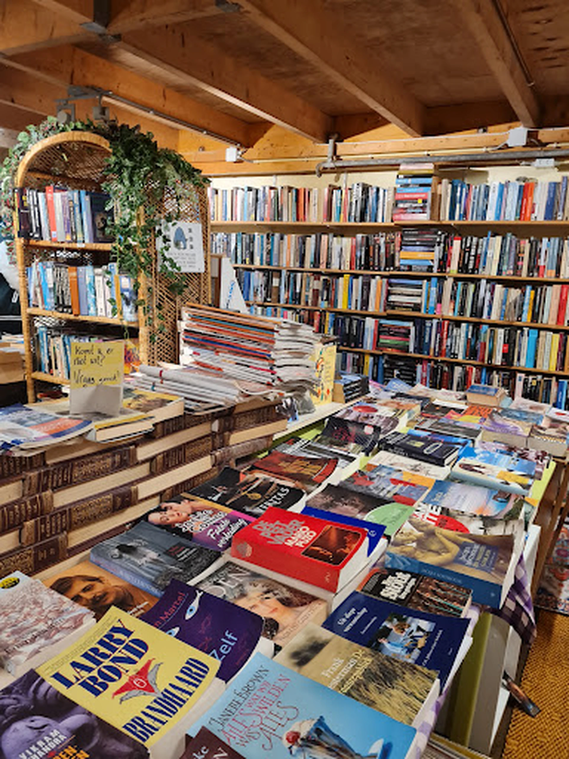 Een sfeervolle, gezellige tweedehands boekhandel in een oude boerderij, bekend om zijn enorme boeken collectie en vriendelijke eigenaresse. De winkel is een paradijs voor boekenliefhebbers, waar je uren kunt neuzen door soms smalle paden en een ruime keuze hebt uit diverse genres en speciale collecties. De prijzen worden over het algemeen als laag ervaren, al zijn er uitzonderingen. De nostalgische sfeer en de rustige locatie zorgen voor een unieke winkelervaring.