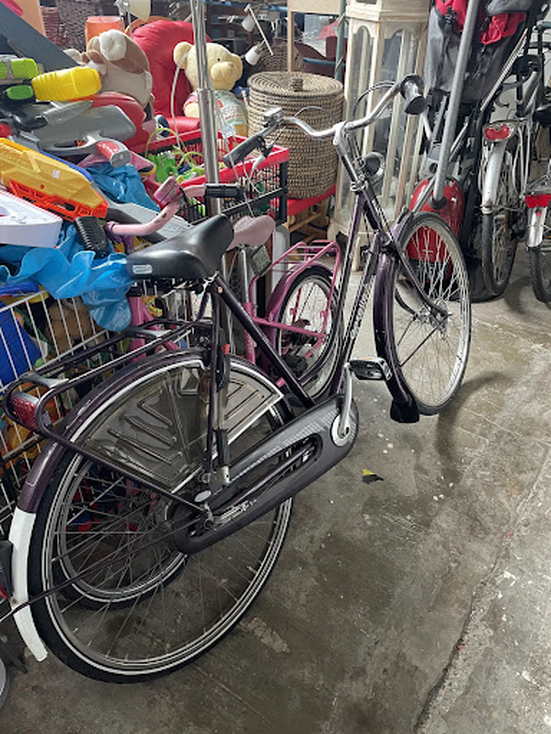 A wild flea market. Here you will find everything or nothing. The items are probably from household clearances. There are bicycles, furniture, pictures, clothes and much more.