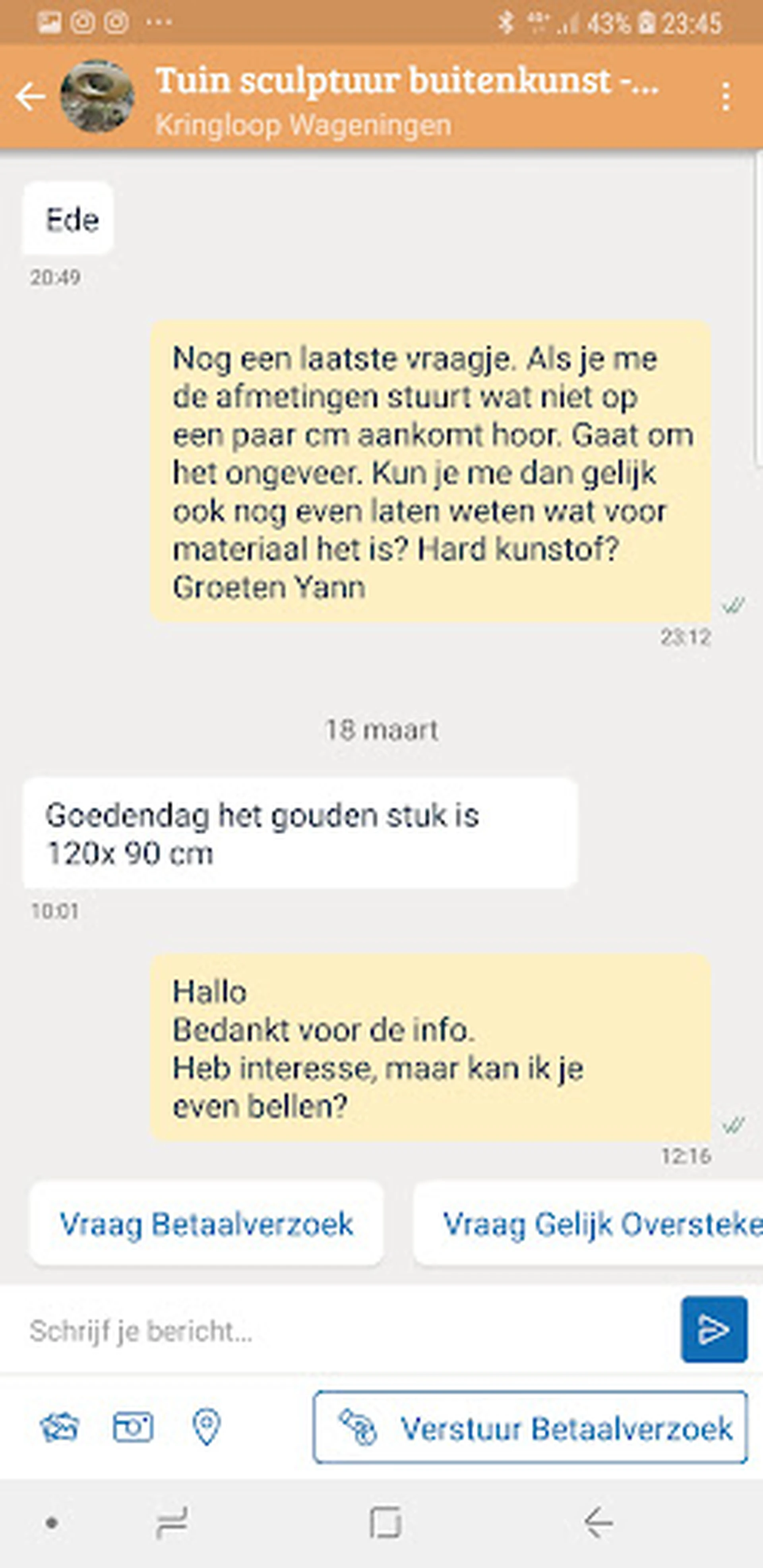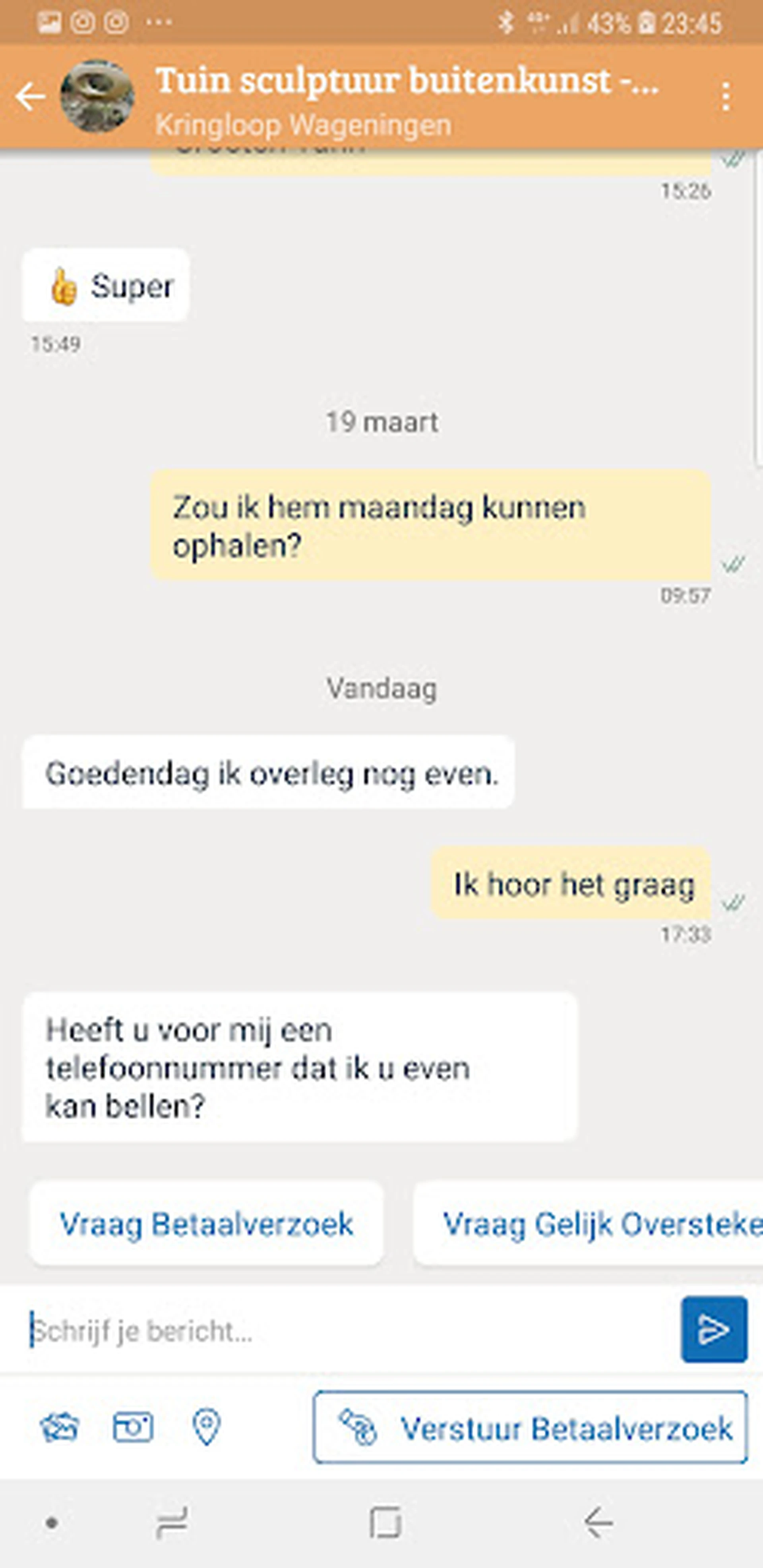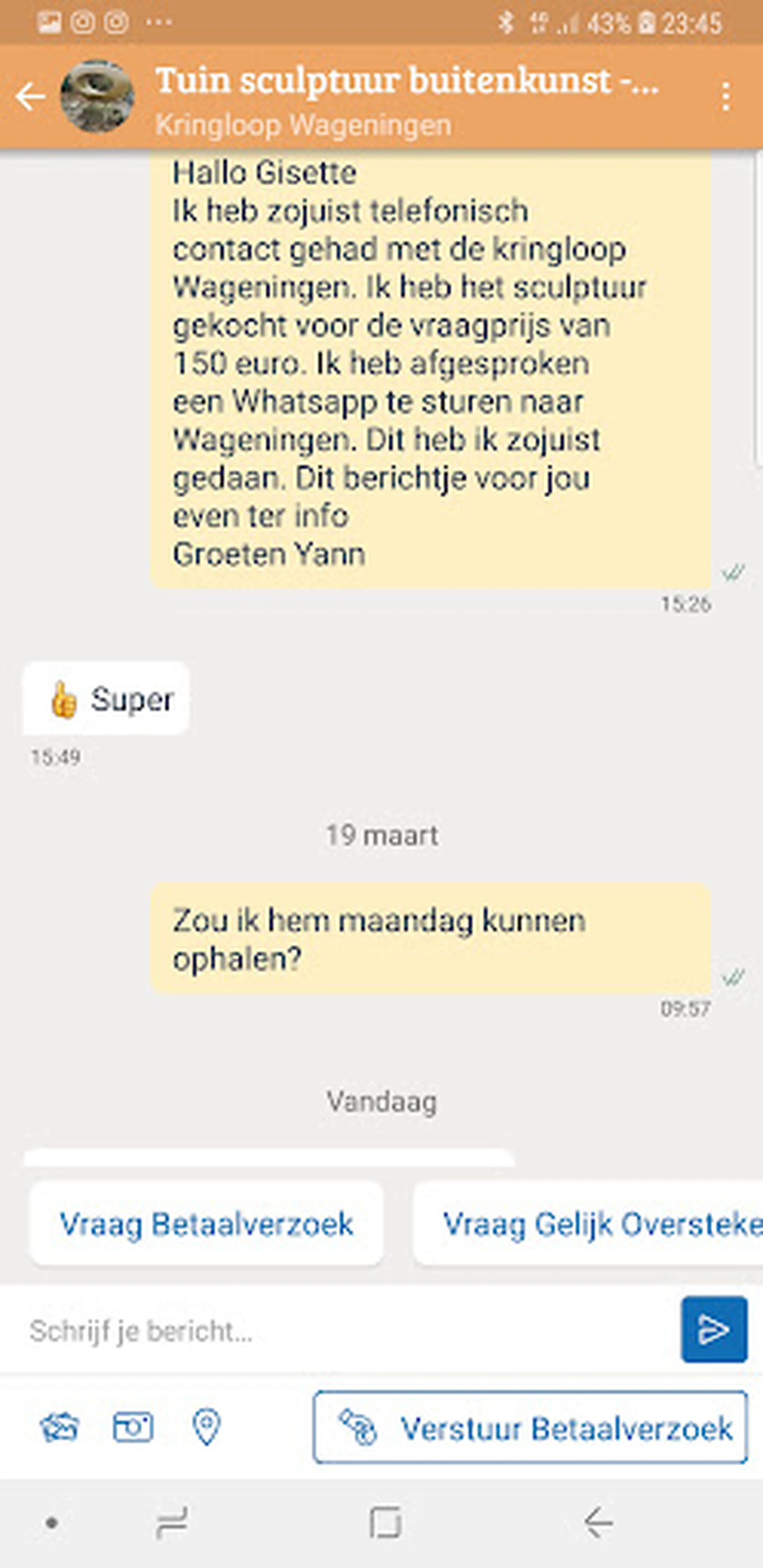 Met deze mensen kun je goede afspraken maken, NIET DUS.... Ze adverteren op marktplaats met een sculptuur voor in de tuin, zie fotos. Je spreekt af iets te kopen, zie printscreens,... voor de prijs van 150 euro. Wanneer je vraagt wanneer je het gekochte kunt ophalen, wordt er gevraagd wordt of men je even kan bellen. Vervolgens krijg je dan te horen dat de afgesproken prijs van 150 euro niet meer kan doorgaan. Je mag het sculptuur nog wel kopen, maar dan wel voor 400 euro. Als dit de manier van zaken doen is van kringloop Wageningen,.... Dan raad ik iedereen af om hier ook maar iets te kopen. WAARDELOOS..