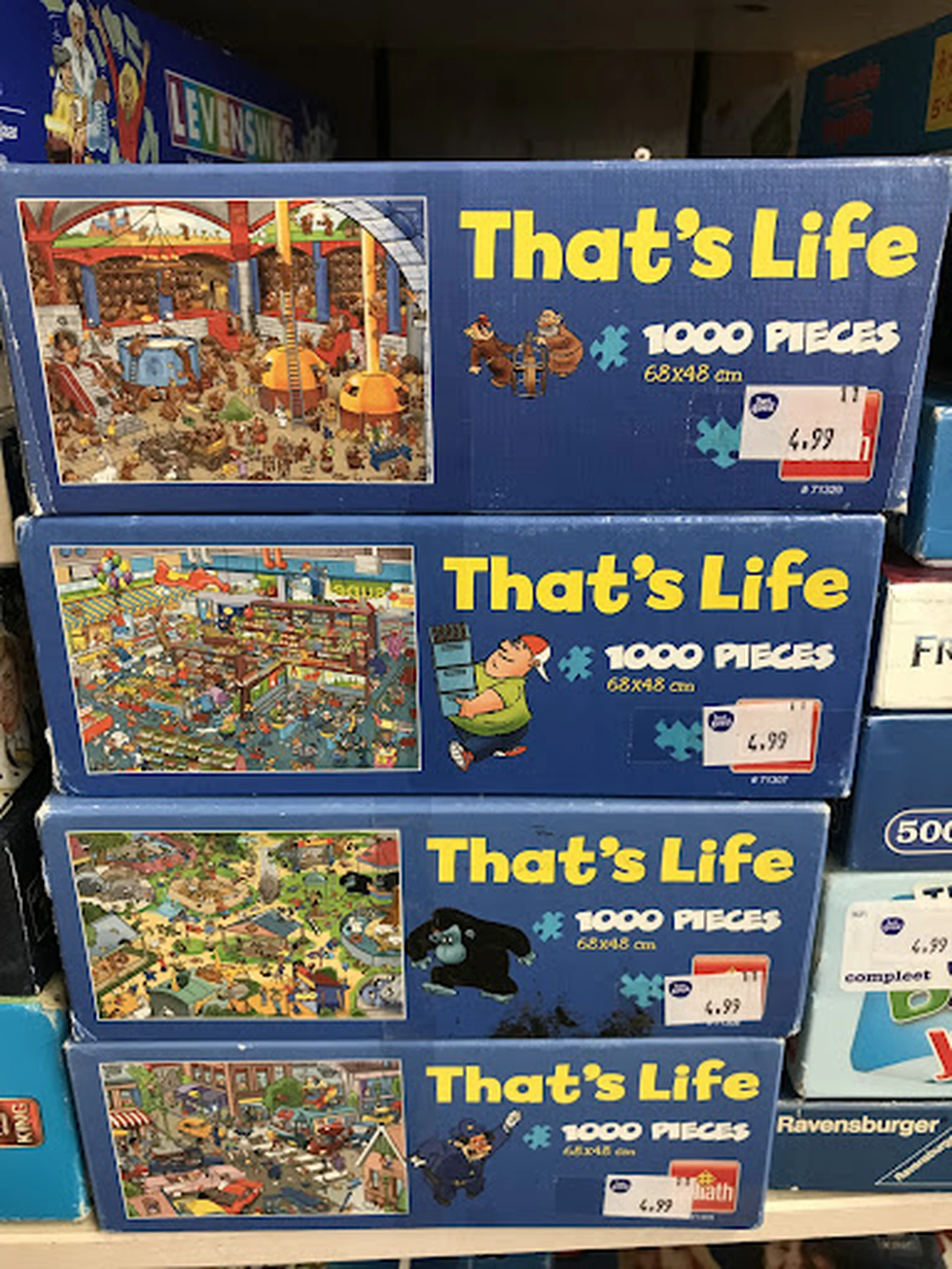 Ruime kringloopwinkel, redelijk aanbod, wel weer veel beschadigde/kapotte (onverkoopbare) spullen. Ongezellige koffiehoek. Sommige spullen te duur geprijsd, zag zelfs een glazen stopflesje dat bij Action nieuw de helft kost (ik heb er zelf een aantal gekocht). Recent voorbeeld: zie foto, Goliath Thats Life legpuzzels geprijsd voor EUR 4,99 per stuk die nieuw bij Kruidvat EUR 3,99 kosten!