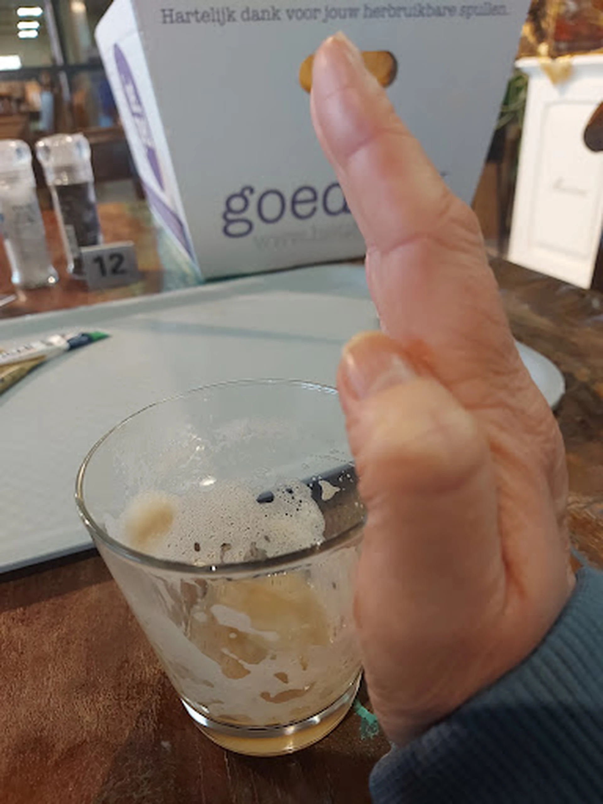Ik had wat bierglazen gekocht die waren 0,50 euro cent per stuk, deze waren leuk en niet te duur! Maar nu komt het ik ging koffie verkeerd halen in het restaurant van de kringloop. Bijna 3 euro voor een koffie verkeerd... Echt belachelijke prijs voor een koffie verkeerd, het is ook nog automaten koffie geschonken in een kleine koffie kop, ik zei er wat van, toen zou ze het in een groter glas schenken, kreeg ik een piepklein glaasje (zie foto.. aan mijn hand kan je zien hoe klein het glas is) Deze kreeg ik 1/3 vol of beter gezegd leeg! Met wat melkschuim er op, ik zei hier ook weer wat van, dat ik het niet accepteer, toen zei ze ik schenk er wat bij...en vervolgens kreeg ik het half vol!!! 😱😱😭😭🤣🤣🤣🤣🤣🤣🤣🤣🤣🤣🤣🤣🤣🤣 hoe strontvervelend en niet flexibel kan je zijn...kompleet aan de service en wensen van de klant voorbij gaan!!!! De koffie smaakt ook echt naar automaten koffie...echt smerig dus! Ik kom hier niet meer terug! Totaal niet klantvriendelijk...net doen of ze je wilt helpen, maar het dan alsnog niet goed schenken tot 3 x aan toe...ze zijn dus niet open voor tegenspraak! Als of ze uit pissigheid je gewoon niet wilt helpen omdat je het er niet mee eens bent...waardeloos!