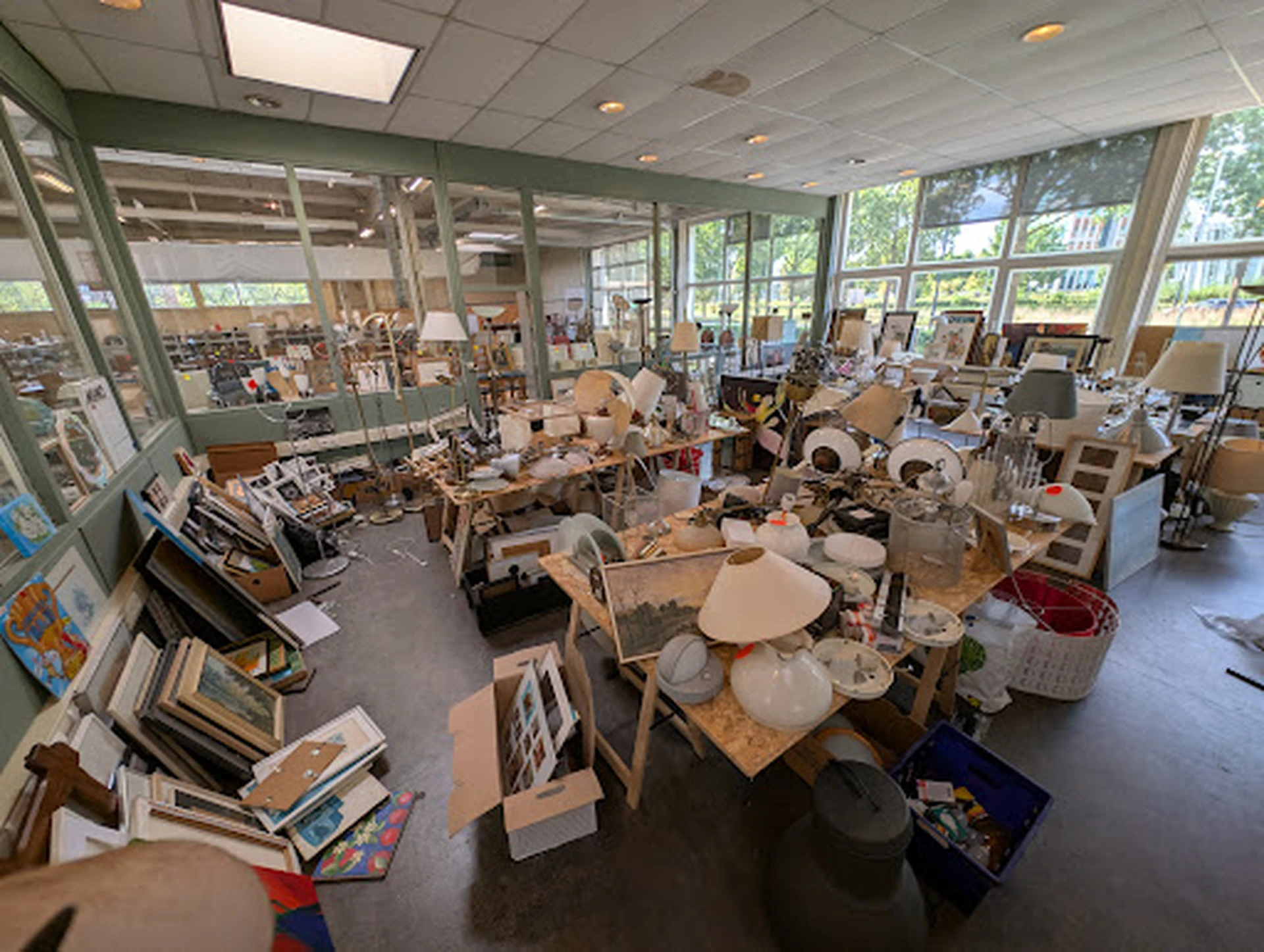 Deze kringloopwinkel is de meest gore en onopgeruimde die ik ooit heb gezien. Er zijn 2 enorme hallen met 'curiosa' waarbij alle spullen kriskras door elkaar liggen in bananen dozen op tafels. De grote spullen, stoelen, kasten en lp,s en cd staan enigszins bij elkaar. Ik zou niets uit de muziek afdeling kopen want onwijze rookmeur daar. Lampen en lijsten hoek ligt allemaal boven op elkaar en daardoor is er veel schade. Niet erg, mits scherp geprijsd. De prijzen zijn heel grof en veelal te hoog! Er wordt niet per artikel gekeken/gestikkerd. Een groot, lelijk en kapot schilderij kost dus bijv. 20 euro. Aan de kassa. Daar doen ze niets met de prijzen. Vrij star. Kortom. Alleen geschikt voor de echte speurneuzen en mensen die van gorigheid, mufheid en rooklucht houden.