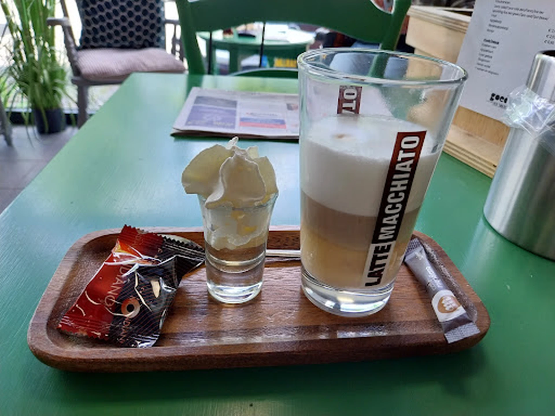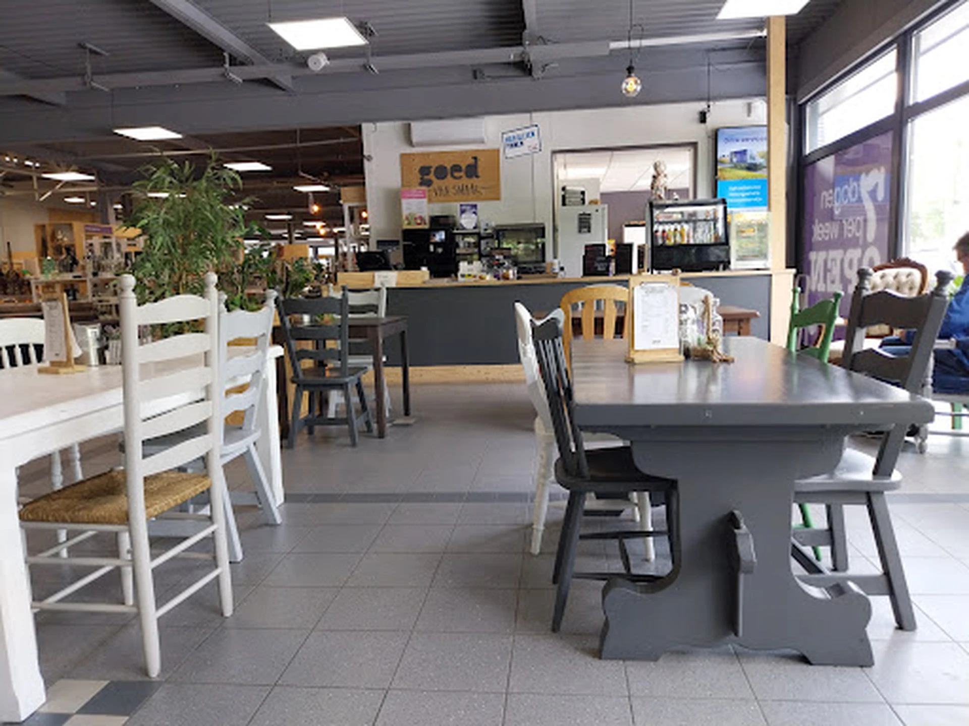 Het Goed Café is schattig en een fantastische aanvulling op de kringloopervaring. De dame die vandaag werkte, zag dat ik zwanger was en gaf me alcoholvrije amarettosiroop in het shotglaasje met een scheutje slagroom. Ik moest erom lachen dat ze dat zag en bediende met een glimlach. De latte machiatto was lekker. Ik heb een kortingsbon gebruikt die ik had gekregen nadat ik spullen had gekocht en gebracht bij de kringloop. Iedereen is daar aardig en eerlijk over de bezorgkosten en de prijs. Er komen geen verrassingskosten bij. Dat waardeer ik. Ik steun deze organisatie volledig om ervoor te zorgen dat tweedehands spullen niet worden weggegooid, maar tegen betaalbare prijzen worden aangeboden. En de kwaliteit is nog steeds goed.