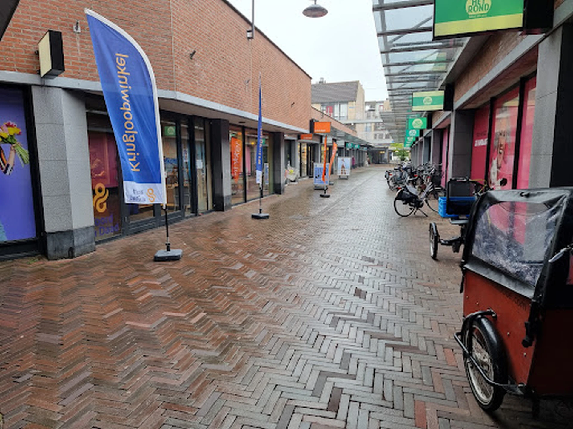 Nette, ruime opgezette winkel in een winkelcentrum. Parkeren in buurt in 'blauwe zone'. Nu, doordeweeks, tijdens dag, weinig parkeerruimte.