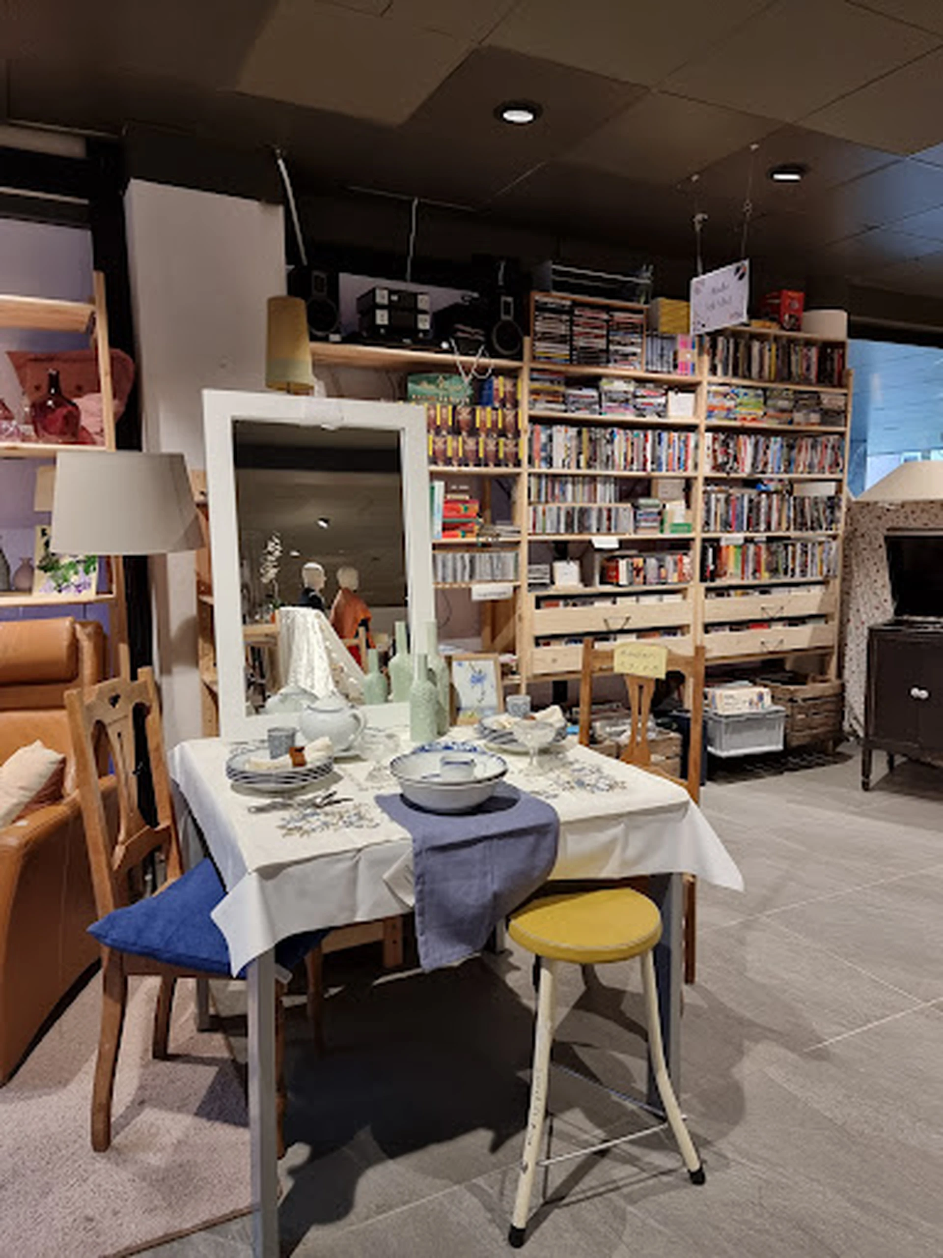 Voor een kringloopwinkel beoordeel ik deze met vijf sterren. Goede kwaliteit spullen, netjes en overzichtelijk gepresenteerd en betaalbaar! Vooral de houten stellingen doen gezellig en gemoedelijk aan.